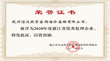喜訊!杭州信達(dá)投資咨詢估價(jià)監(jiān)理有限公司榮獲2020年度浙江省優(yōu)秀監(jiān)理企業(yè)的榮譽(yù)稱號(hào)?